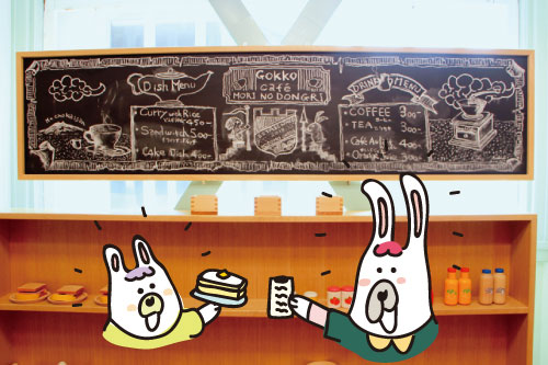館内にある、食事やお茶ができるカフェ。 木をたっぷり使った温かみのある空間で地元産米のおにぎりや、特産のフルーツを使ったスイーツを楽しめます。 |