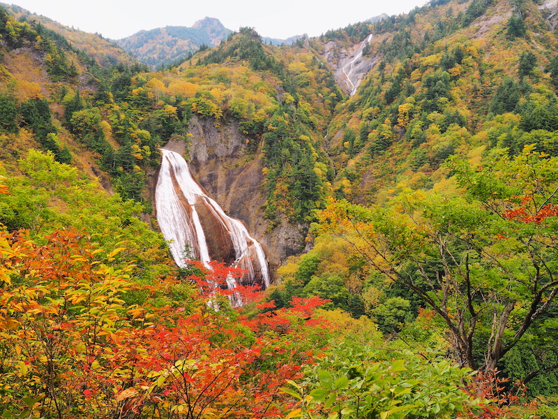 日本の滝100選に選ばれた落差80m、幅40mを誇る東北地方最大クラスの滑川大滝と紅葉のコントラストが魅力。滑川温泉から登山道を登って30分くらいの高台にある展望台から眺望できます。